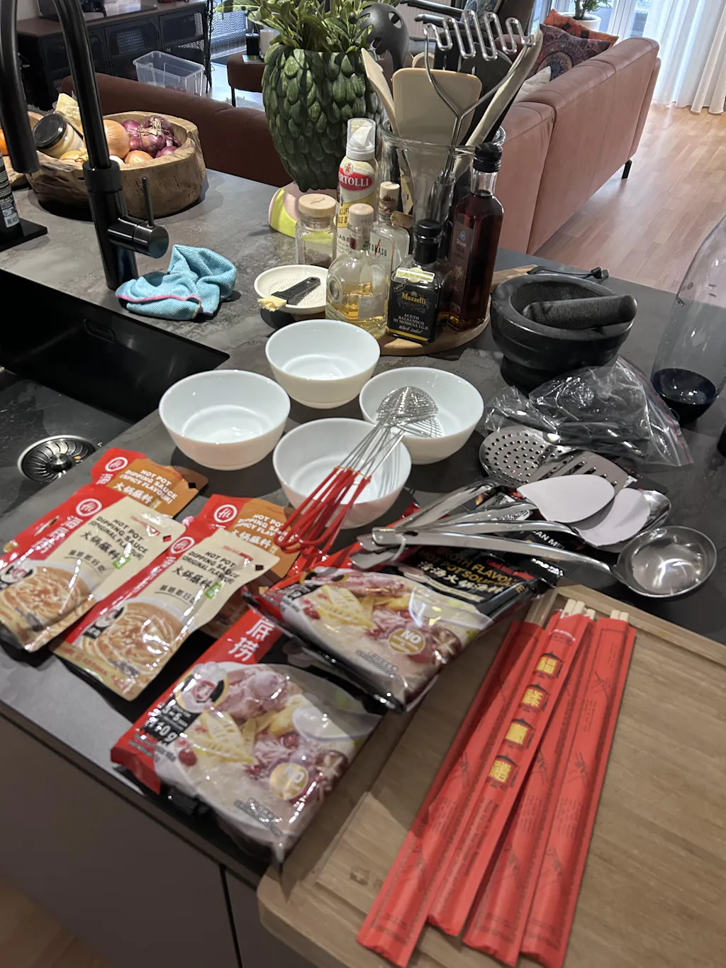 De soepbasis is echt heerlijk! Ik heb lams- en rundvlees bij de slager gekocht, thuis ingevroren en vervolgens in dunne plakjes gesneden. Ik heb ook gesneden aardappelen, spinazie, taugé en Chinees kool klaargelegd. Ik hoef helemaal niet meer na te denken over wat ik 's avonds ga koken, zo handig en lekker! Ik ga zeker nog meer soepbasis en dipsaus kopen! <3<3<3